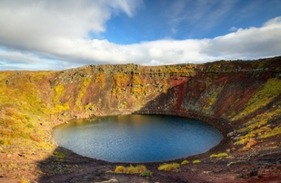 Kerið火山口湖位于冰岛西部火山区,是区内七大火山口湖之一。它形成于大约6500年前,水深7至14米。大部分火山口湖都被陡峭的岩壁围绕着,而这个火山口湖却有一面相对平缓的岩壁,人们可以顺着这面岩壁接近湖面。湖水清澈透明,富含的矿物质使湖面显现出鲜艳的色彩,并会随着光线的变化而变换颜色。
